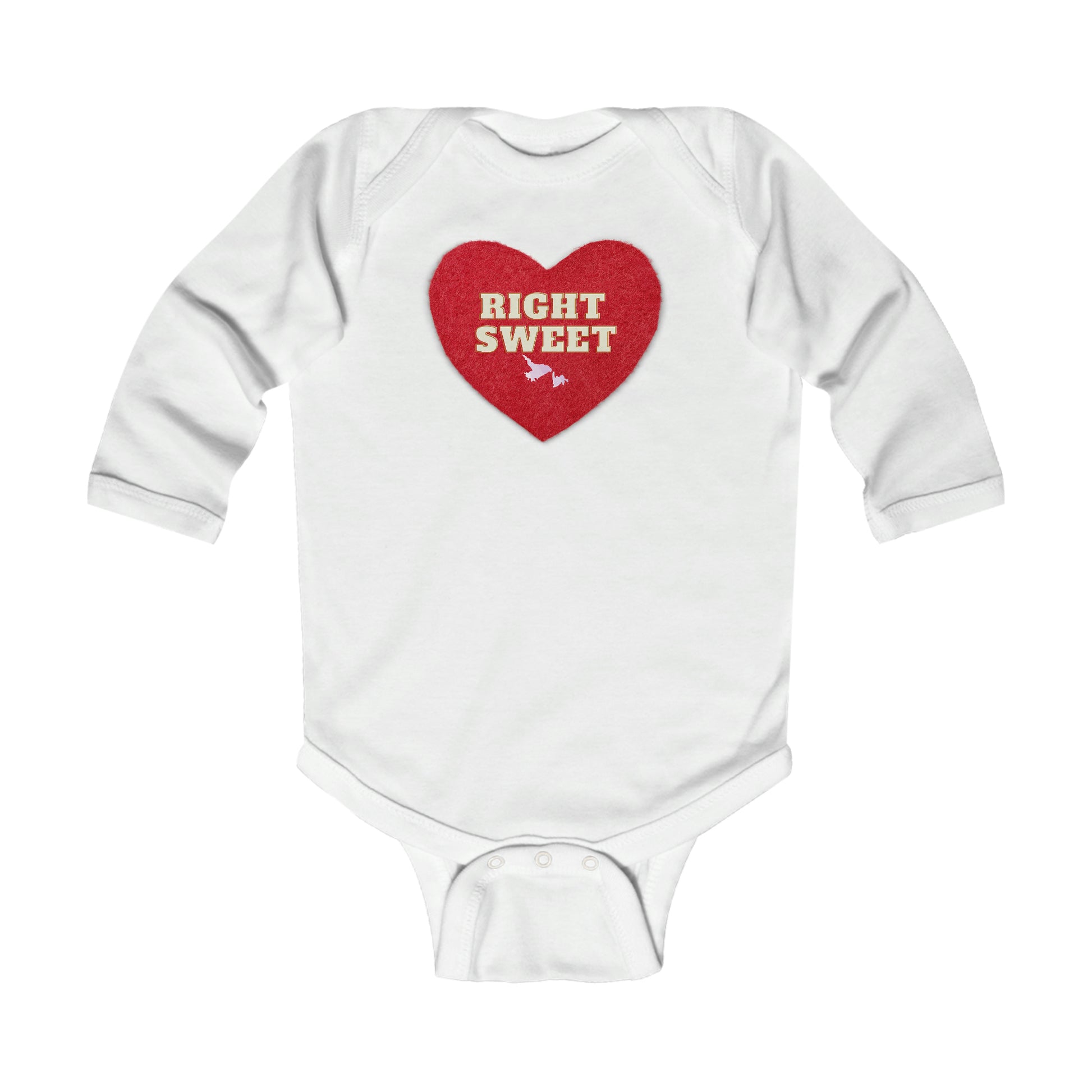 How adorable is this baby onesie featuring the phrase Right Sweet with a big red felt look heart. Available size Newborn - 18m