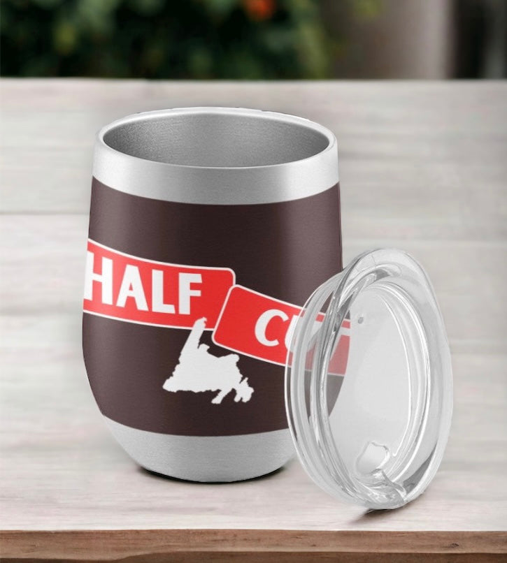 - Enjoy your favorite hot and cold beverages with our HALF CUT Wine Glass! Glass holds 12 oz and is made from double-wall stainless steel vacuum construction with push-in sipper lid. Available online only.